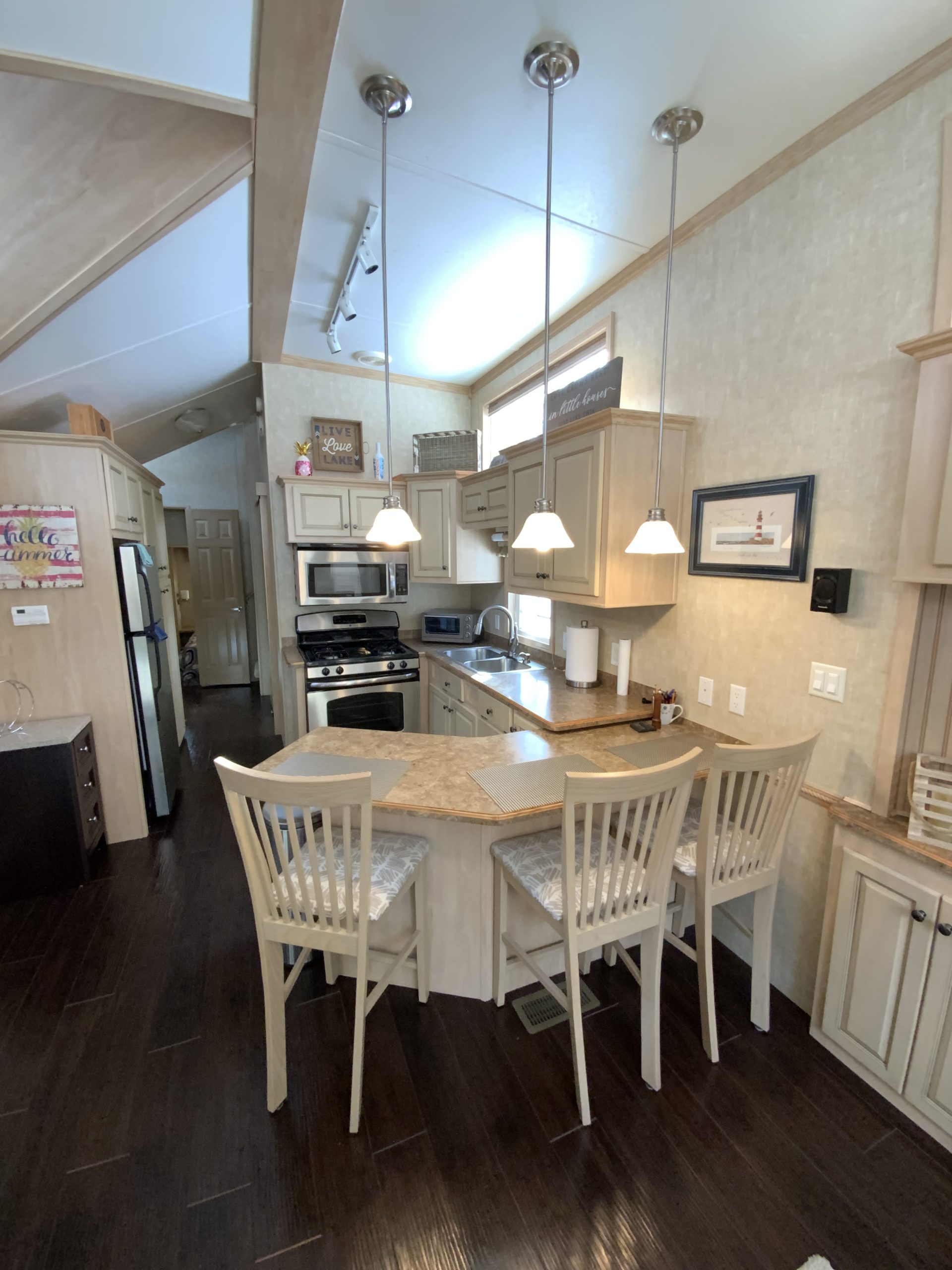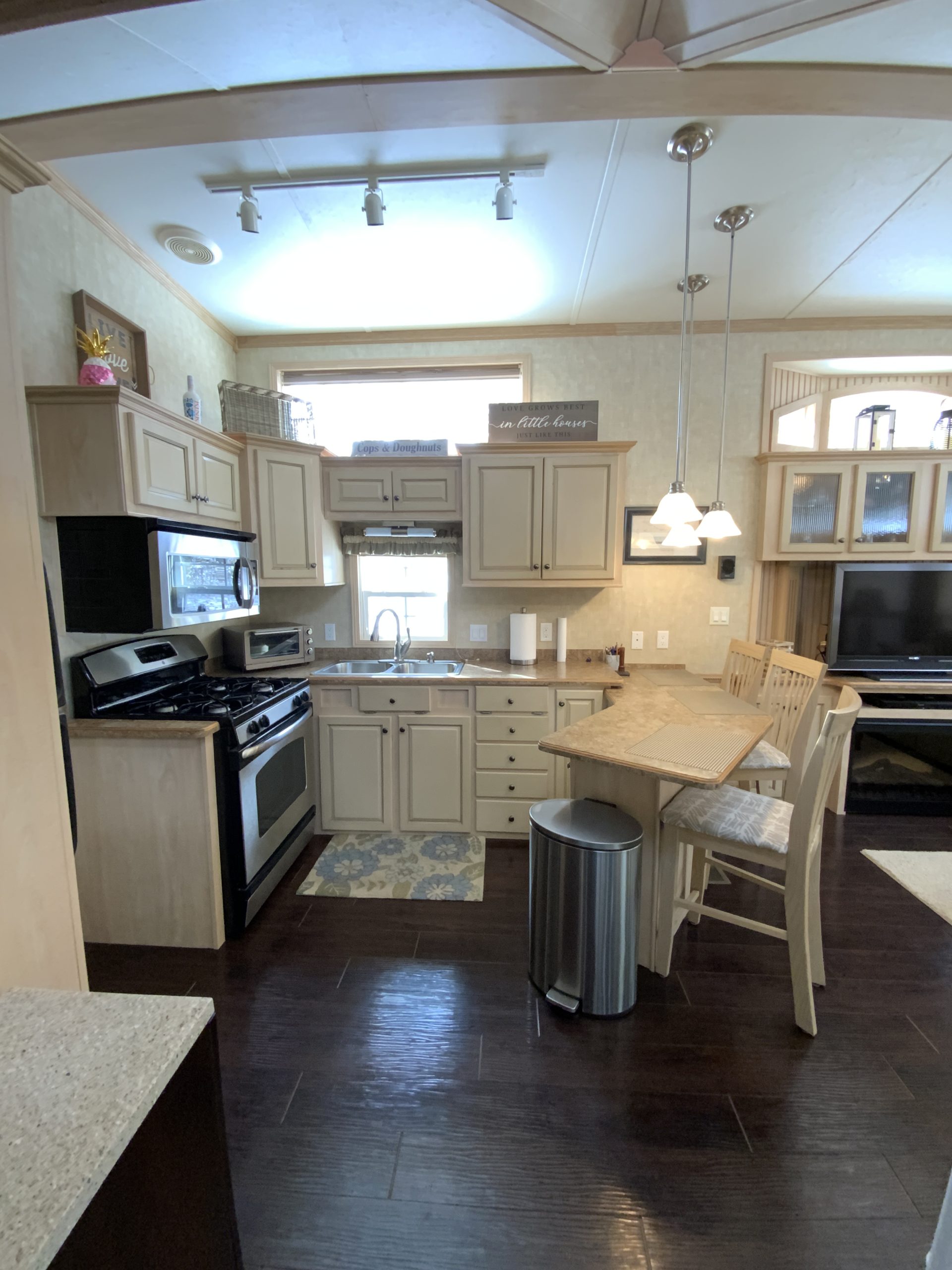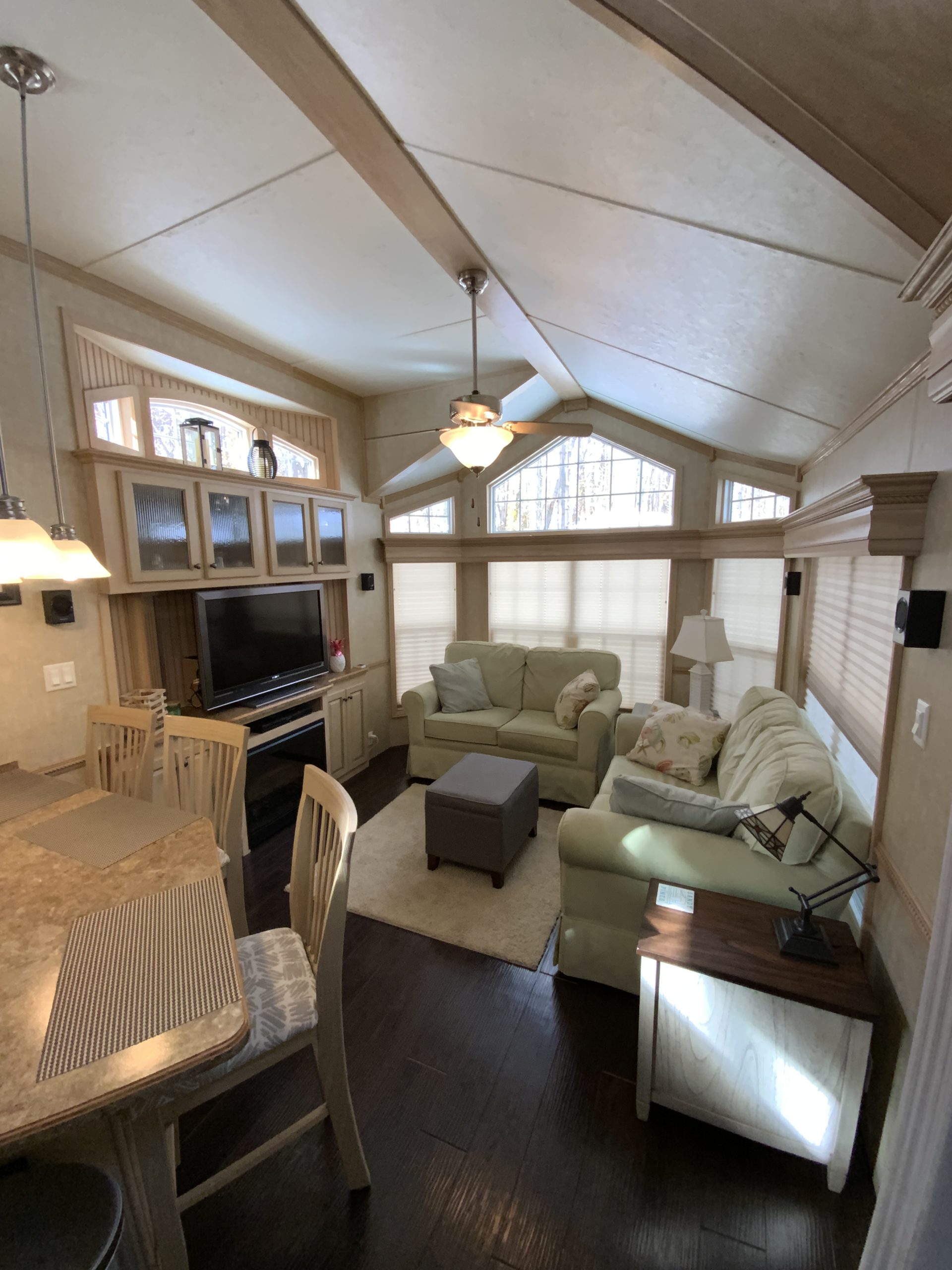 Outside features a large 11×18 garage, perfect for golf cart parking and storage, with extra floor supports for heavier vehicles if needed. A custom E-Z-Go golf cart is included for easy travel around the park. The additional porch provides extra space and an elegant outdoor seating area for relaxing or entertaining.