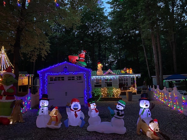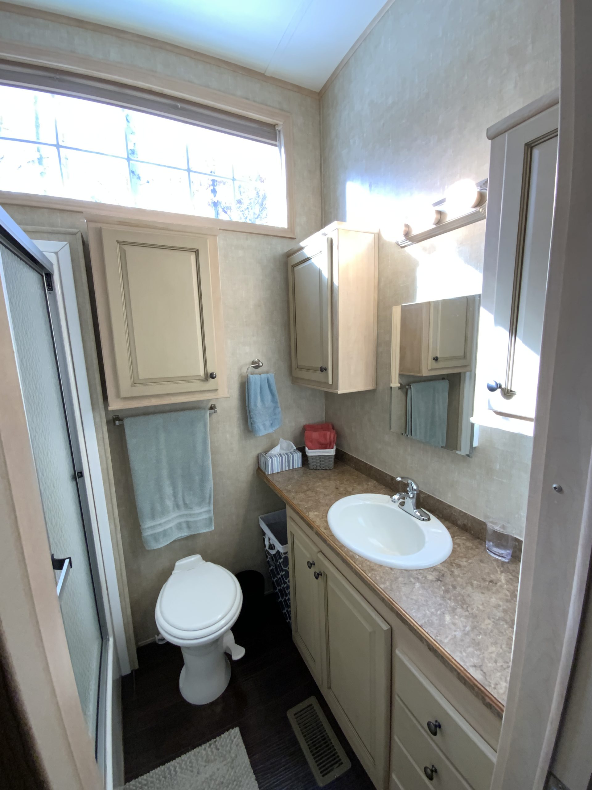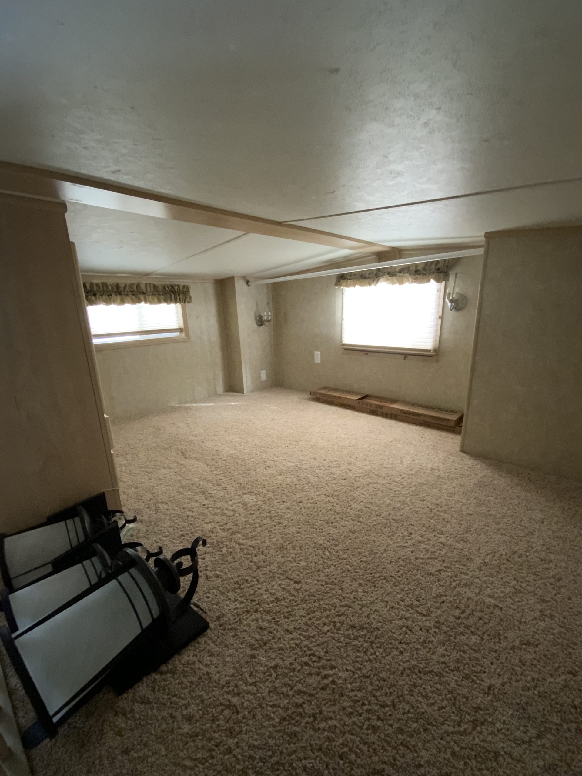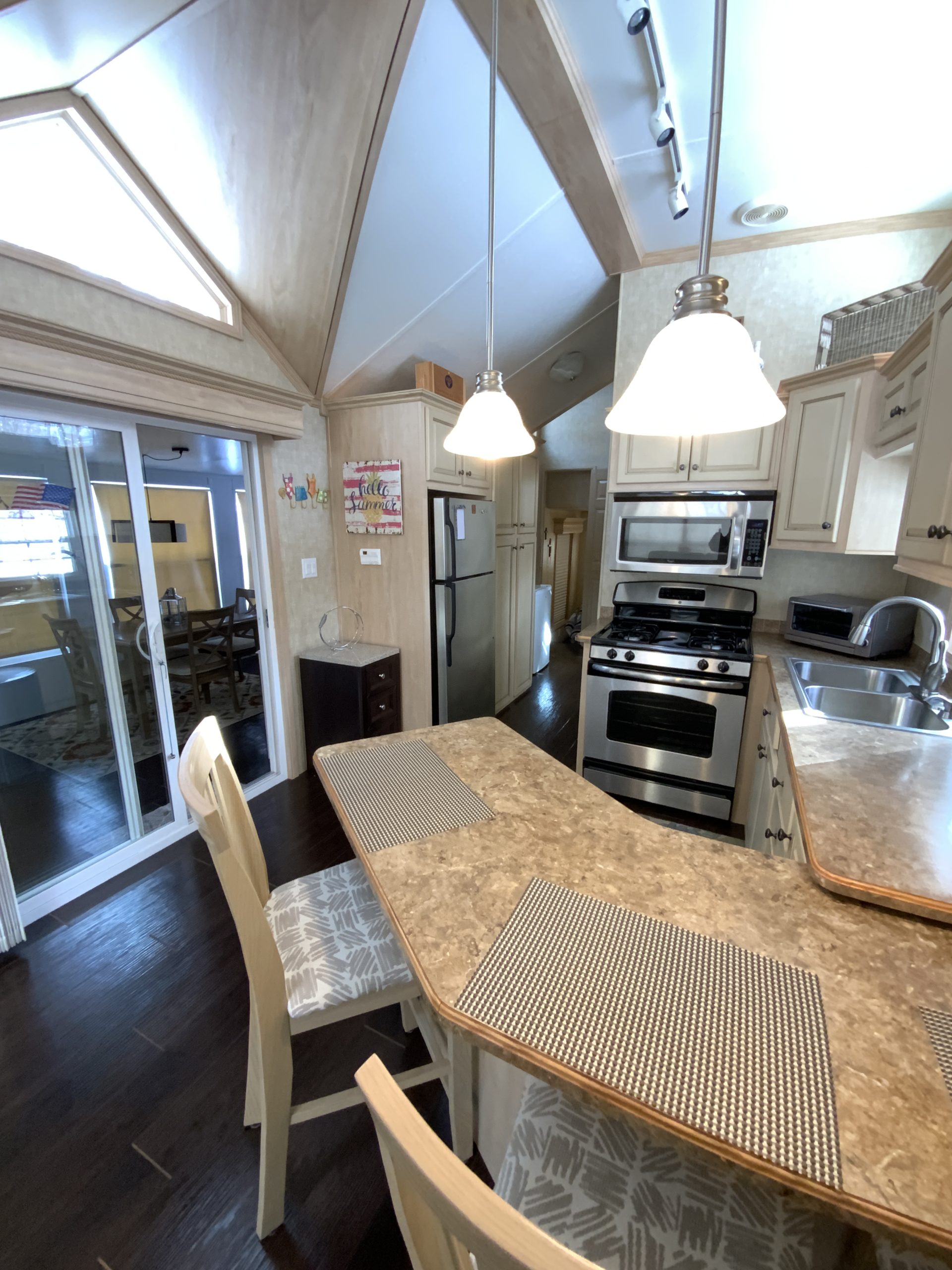 Outside features a large 11×18 garage, perfect for golf cart parking and storage, with extra floor supports for heavier vehicles if needed. A custom E-Z-Go golf cart is included for easy travel around the park. The additional porch provides extra space and an elegant outdoor seating area for relaxing or entertaining.