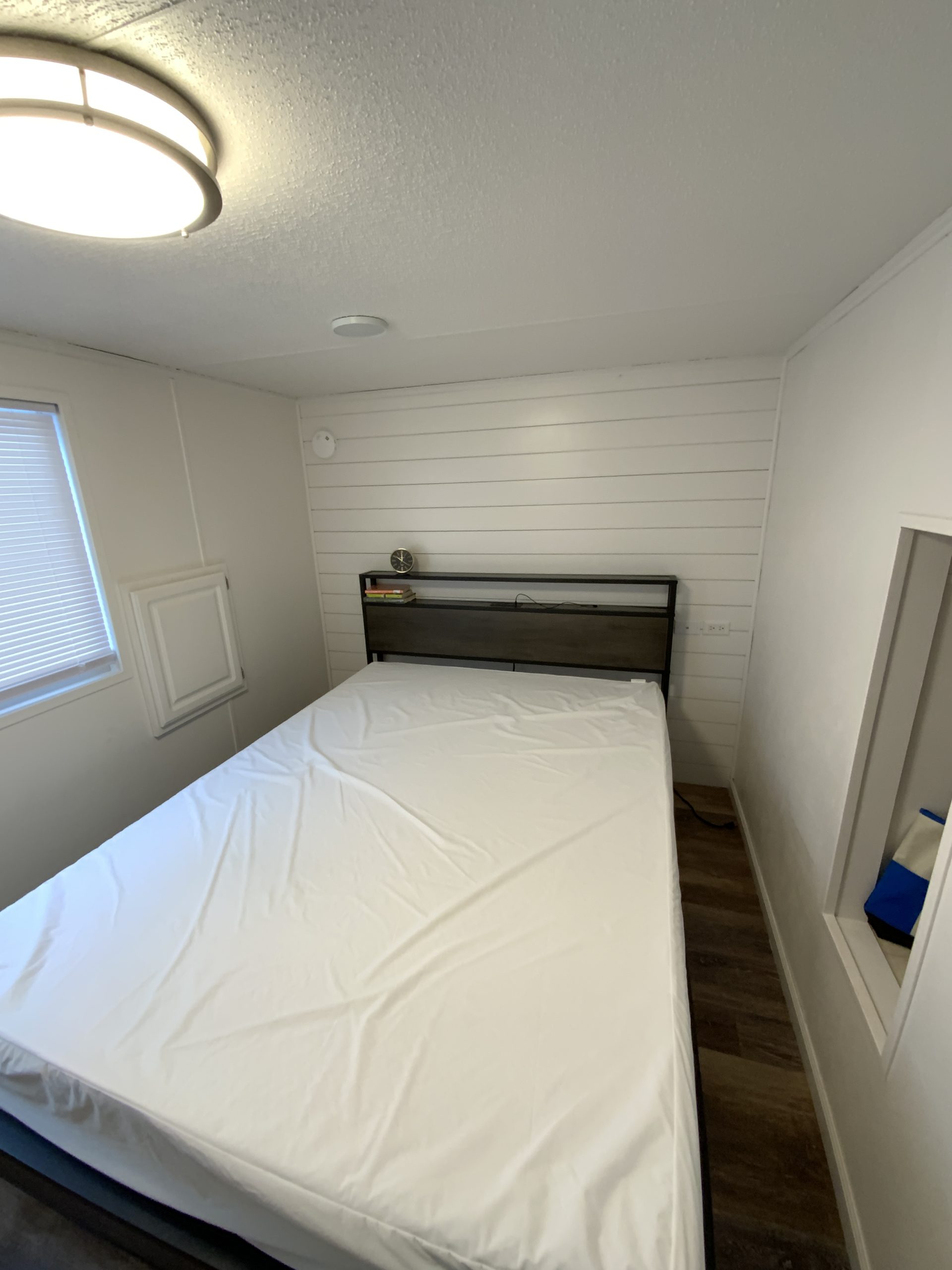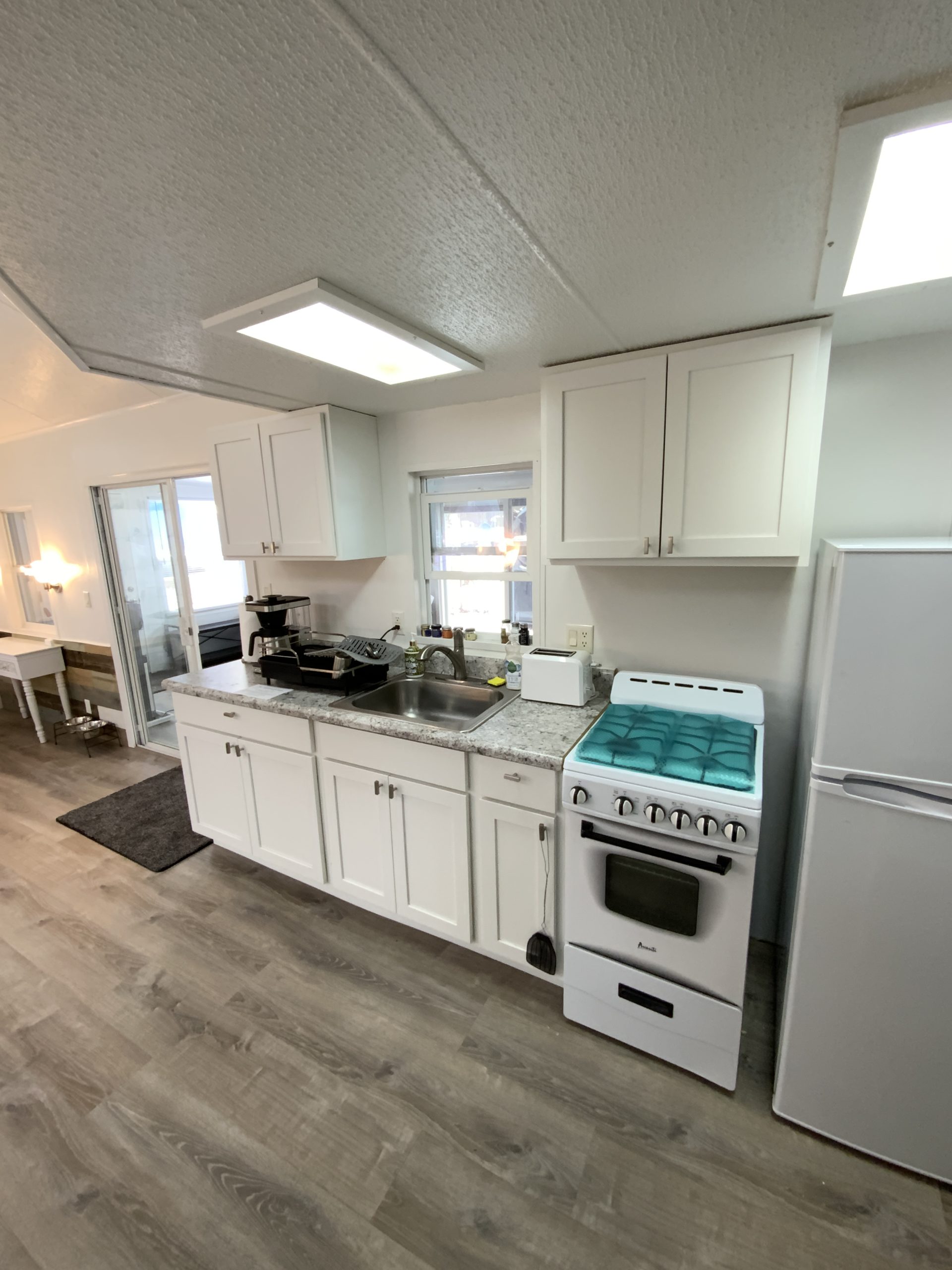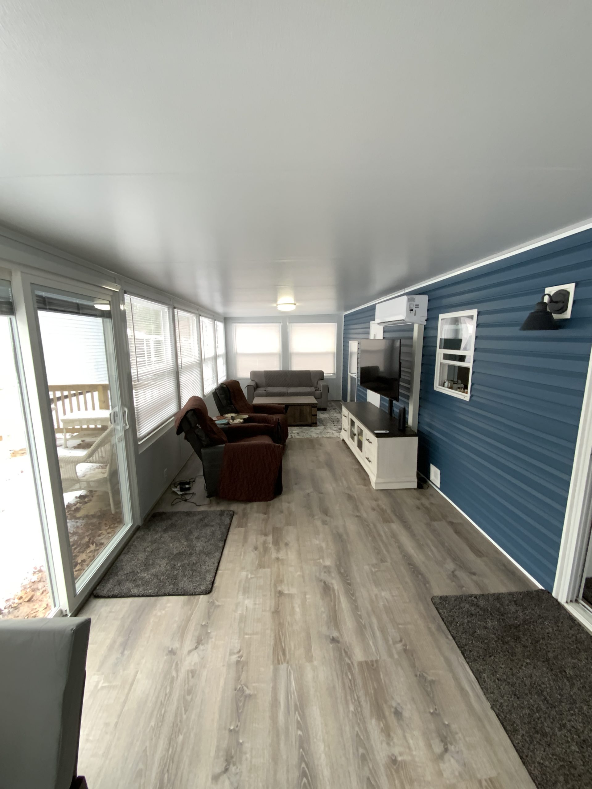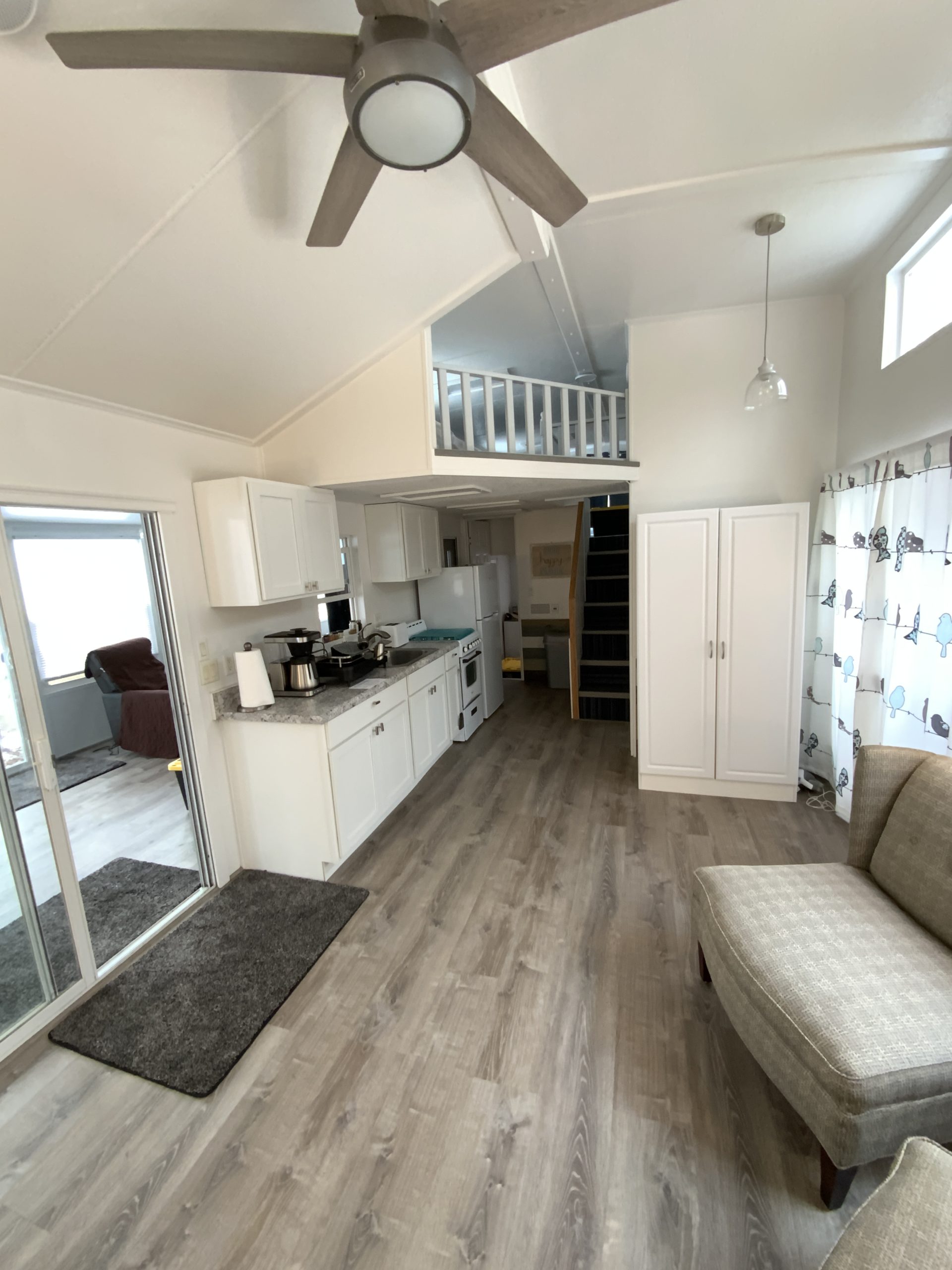 The fully renovated kitchen is a standout, featuring all-new cabinets and appliances from top to bottom. New flooring runs throughout both the park model and porch, tying everything together with a clean, modern feel.