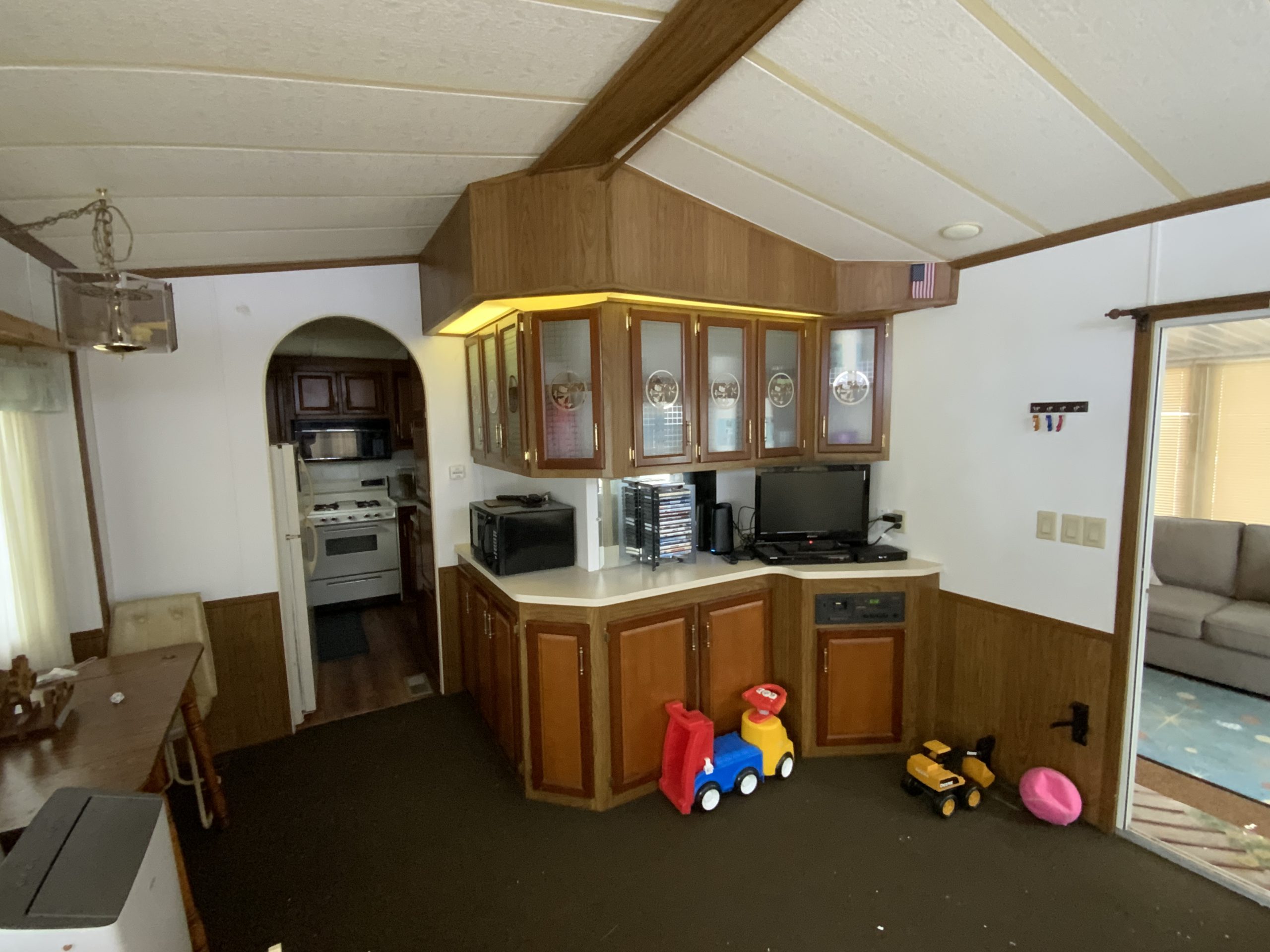 Check out this charming 1992 Trophy Park Model located on lot 4436, perfectly positioned on a beautiful pie-shaped waterfront lot. This one bedroom, one bath unit offers a fantastic opportunity to enjoy waterfront living at an affordable entry point.